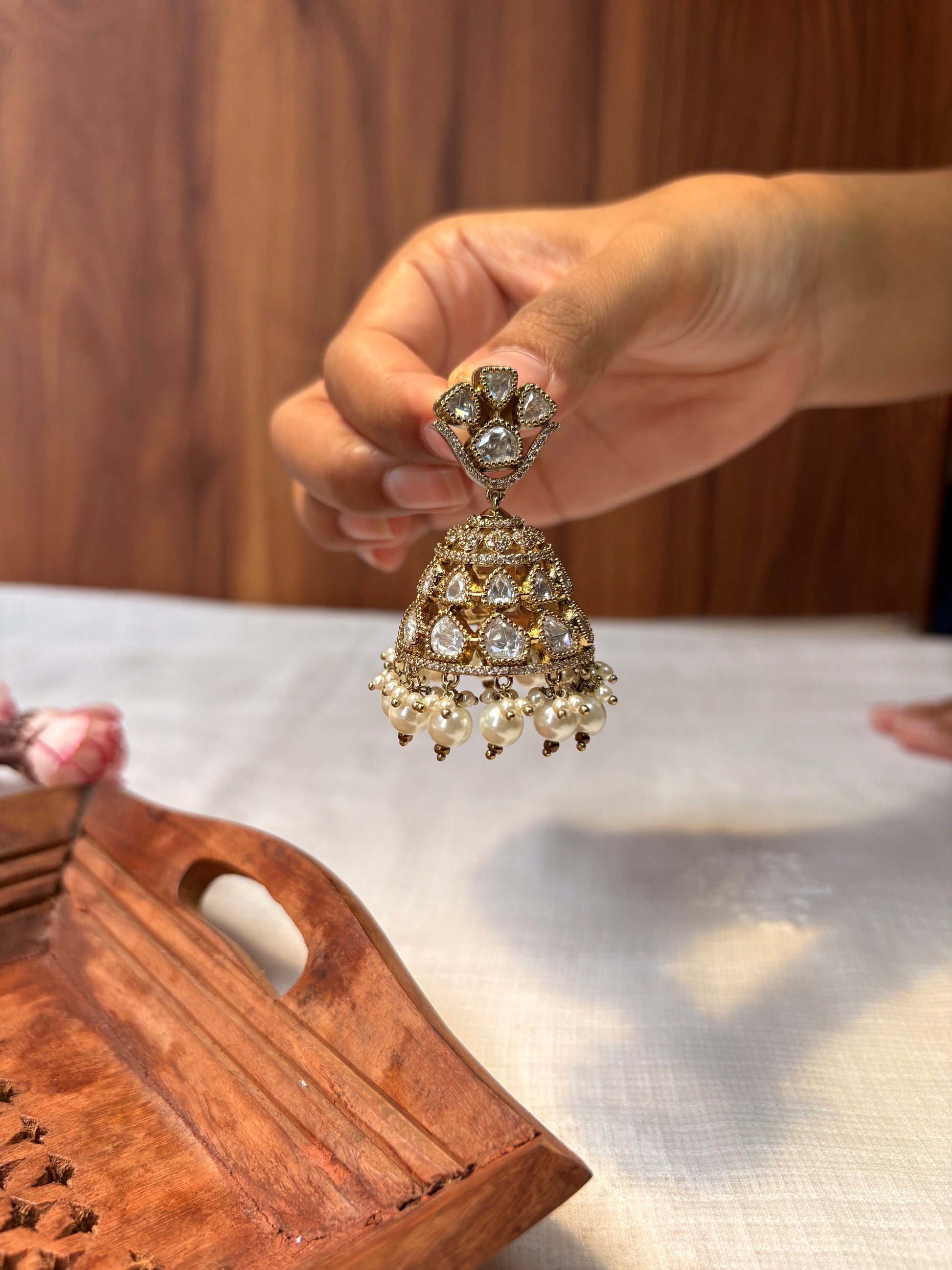 Delicately crafted in 100% pure brass, these dome-shaped jhumkis feature shimmering American Diamonds and soft pearl drops. A timeless blend of tradition and elegance, perfect for festive and wedding occasions.