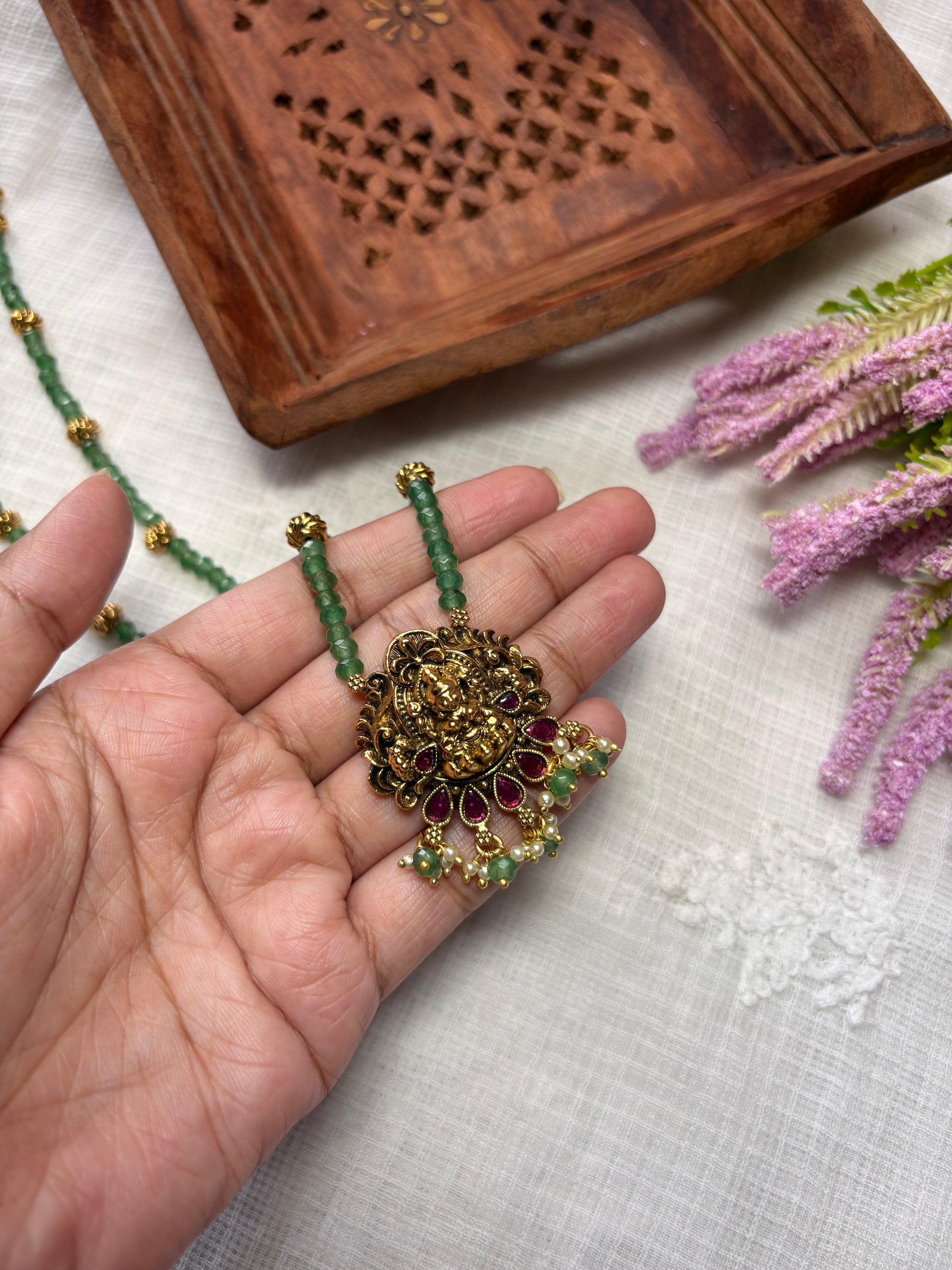 Crafted in 100% brass, this set features a detailed Lakshmi temple pendant with ruby and green accents, paired with green bead strands and matching jhumkas. A traditional and divine piece, perfect for weddings, temple wear, and festive occasions.