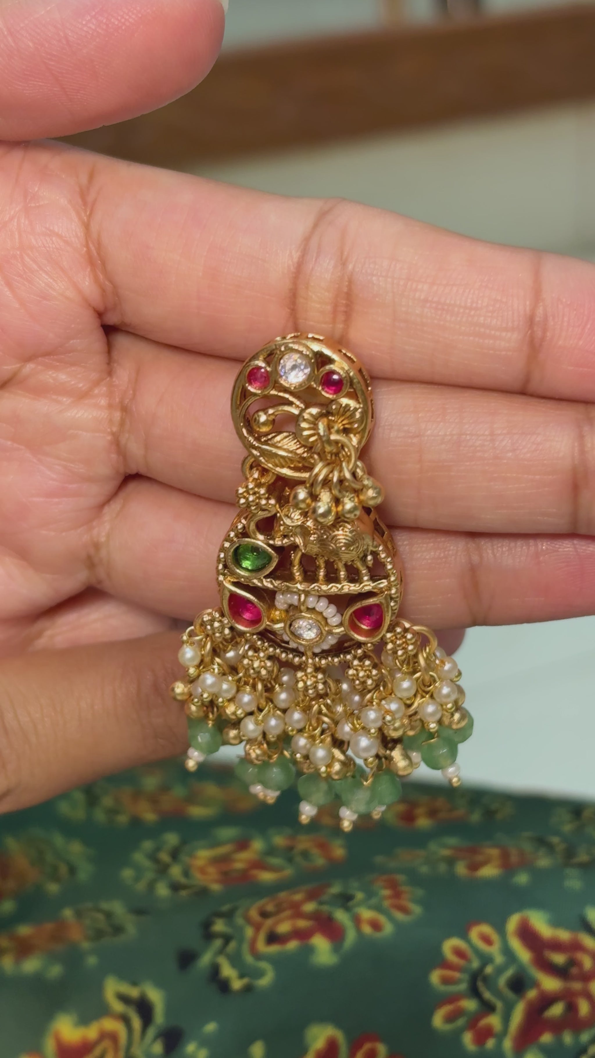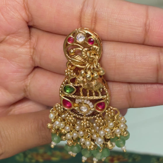 Crafted in 100% brass, these temple-style jhumkas celebrate traditional Jadau artistry with intricate deity motifs, ruby-green stone accents, and pearl danglers. A statement piece that brings regal heritage and festive elegance together.
