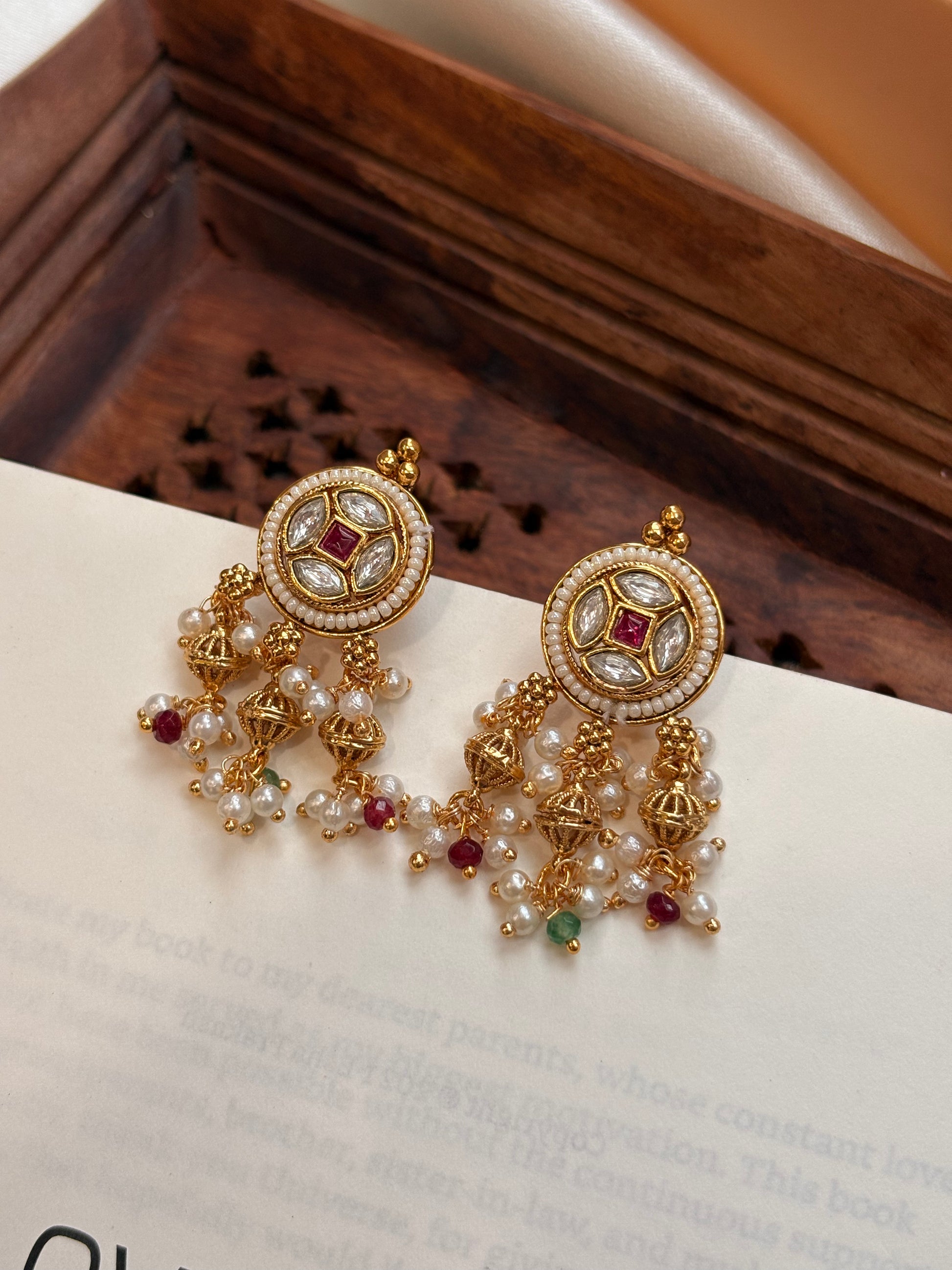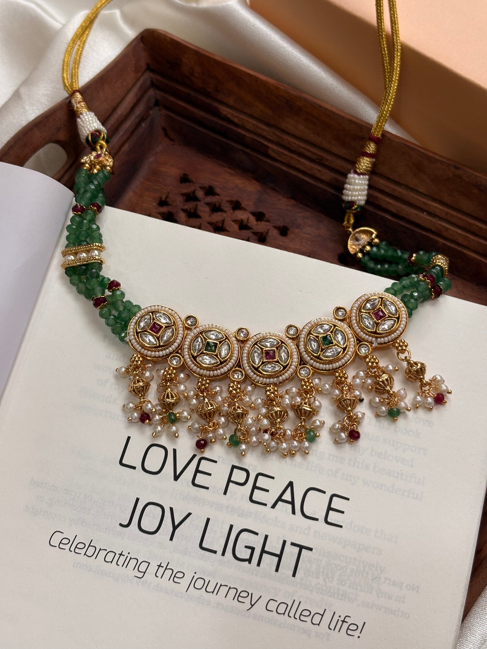 Made from 100% brass, this choker features five beautifully detailed circular motifs with coloured stones and pearl accents. Finished with green beads and pearl danglers, it’s a perfect pick for festive outfits or wedding looks.