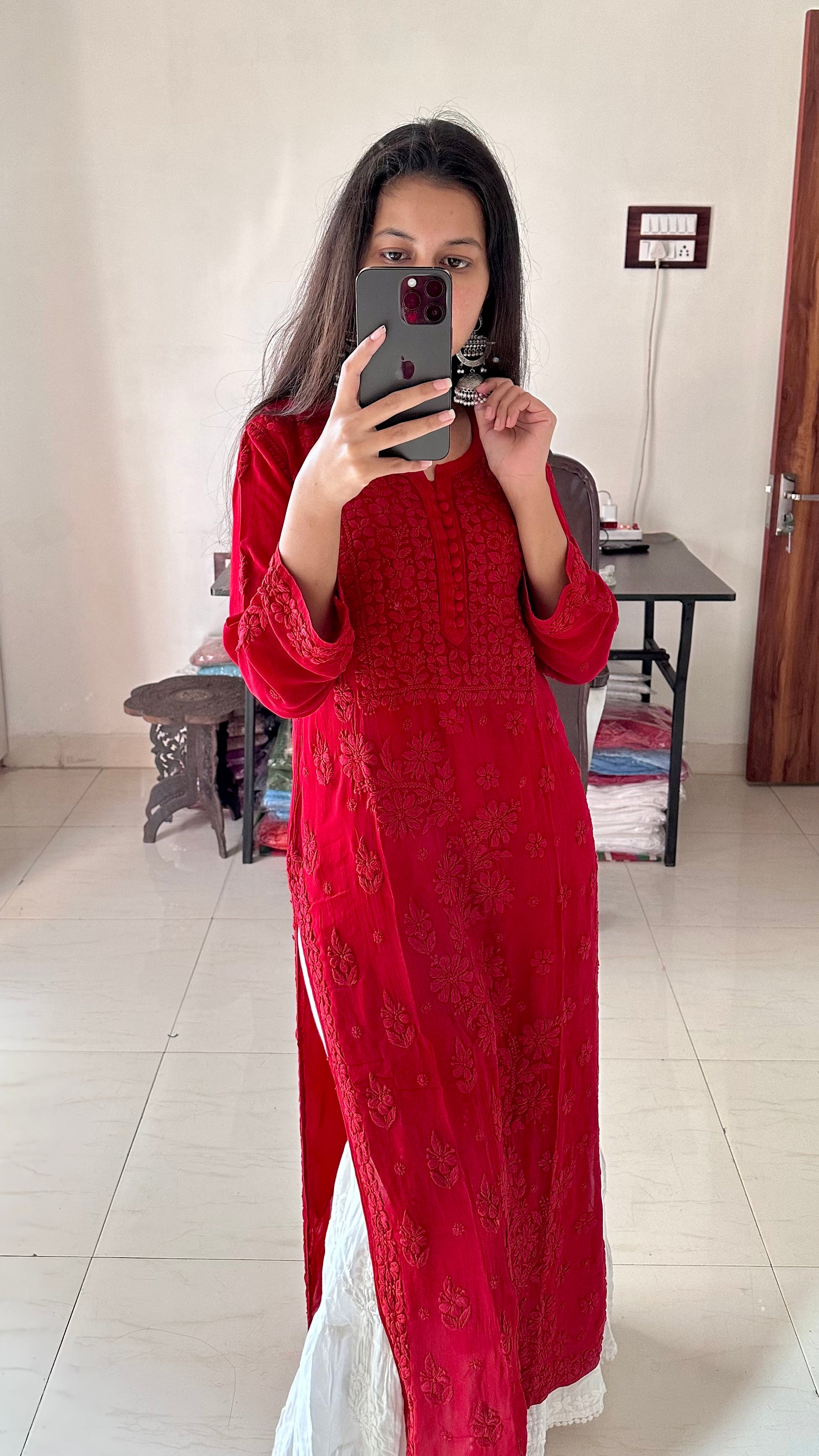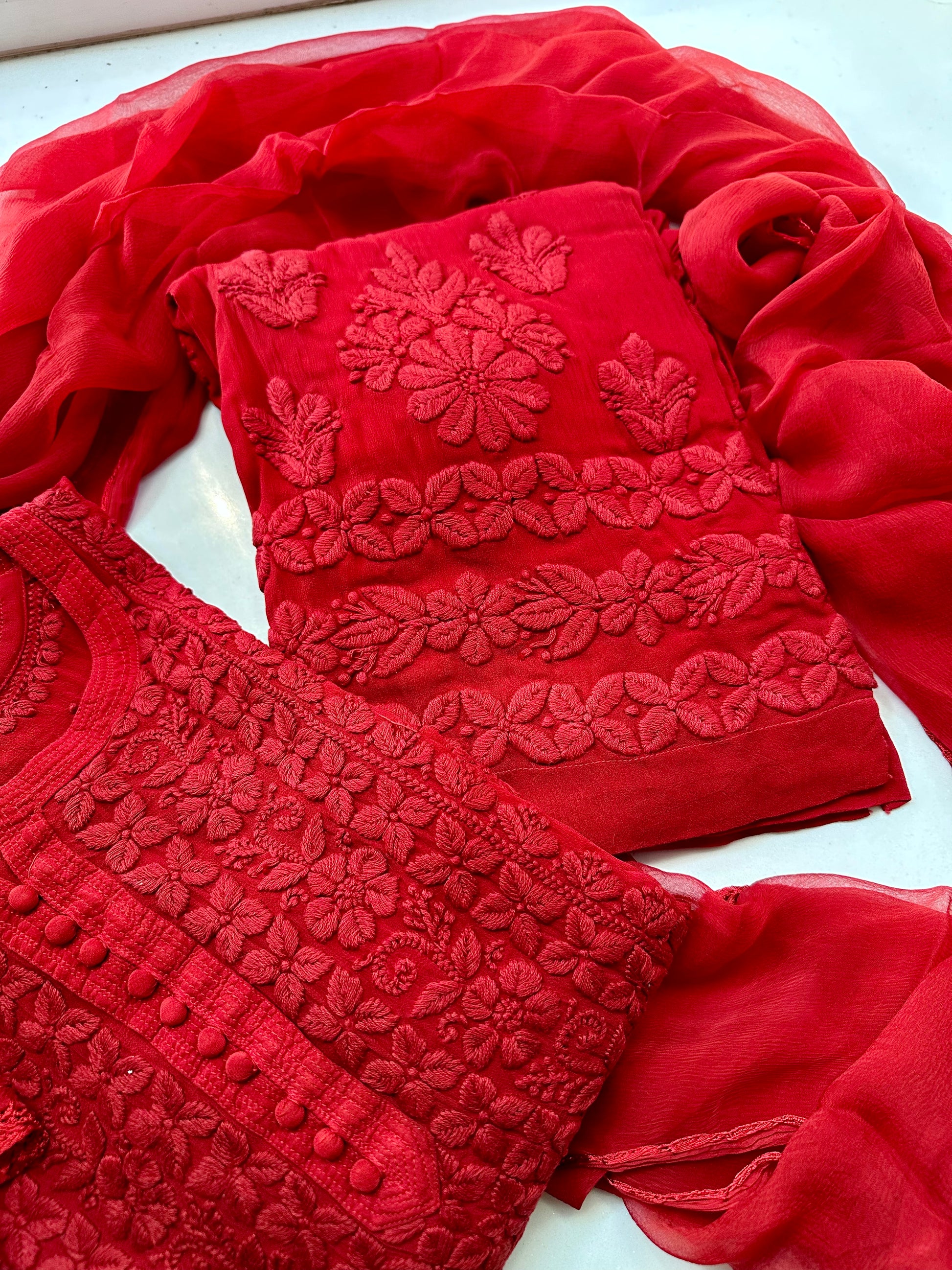 Three-piece suit set, in (kurta, Bottom,, and Dupatta ) Heavy Neck work and button details. This Makhan soft pure georgette kurta comes with a Mul cotton inner.