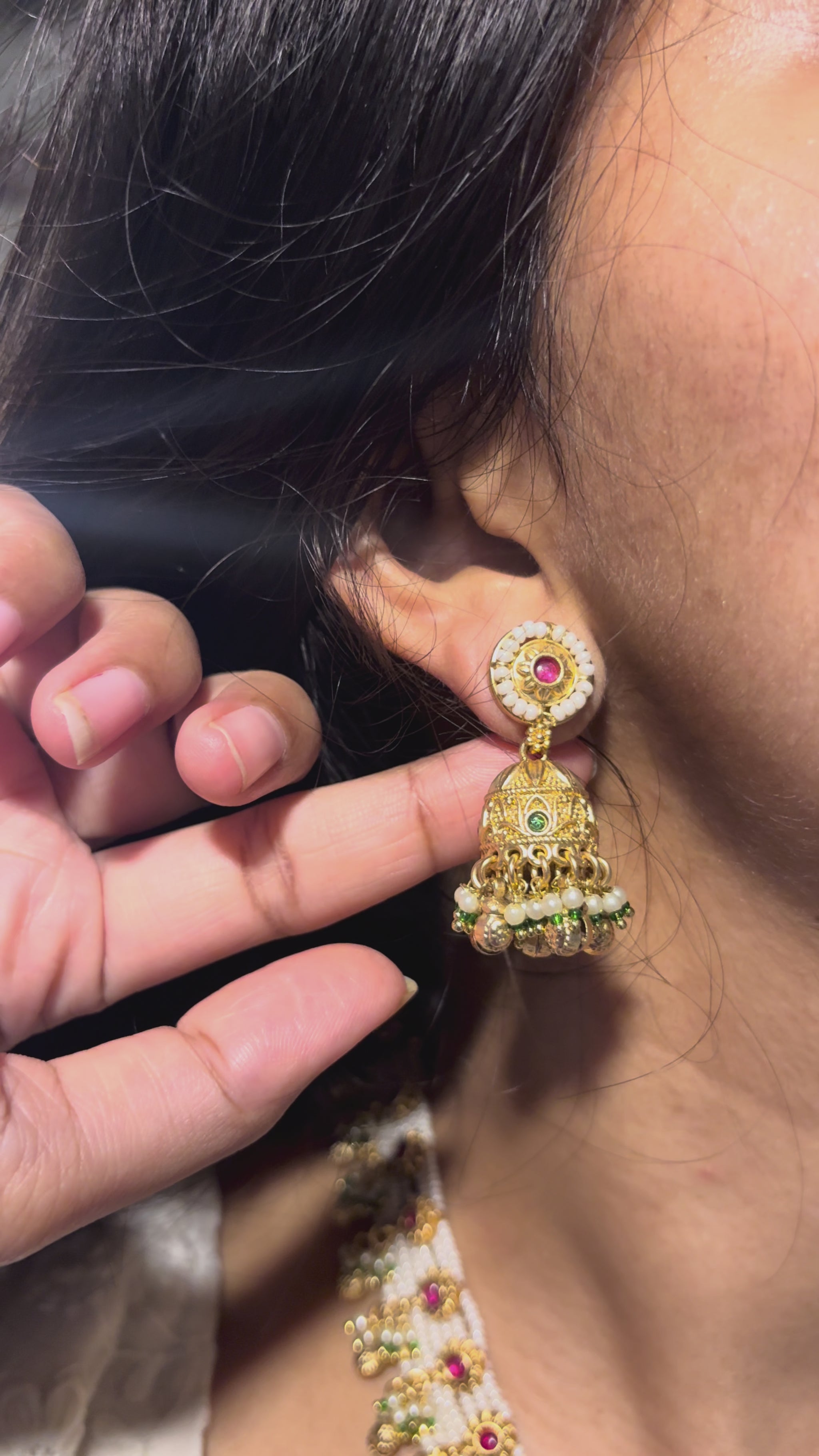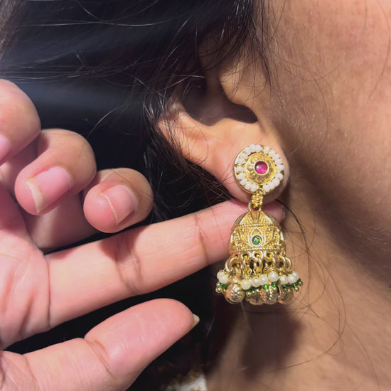 This 100% brass choker set features layered white beads, ruby-toned stone accents, and golden ghungroo detailing. Paired with matching jhumkis, it’s a graceful pick for festive, bridal, and traditional wear.