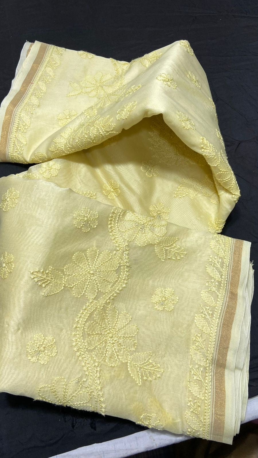 Moonlight lemon yellow Pure Chanderi silk Chikankari saree