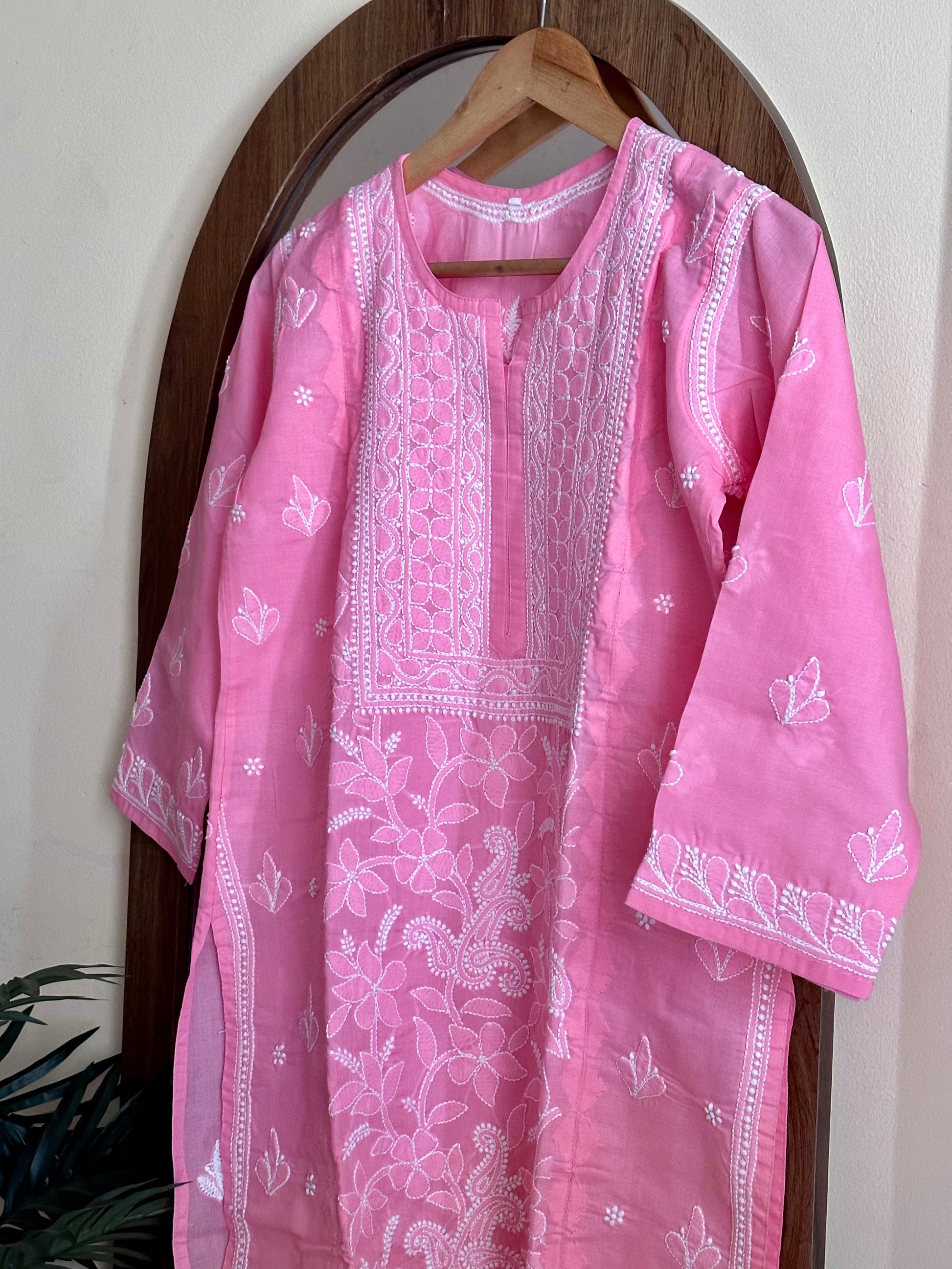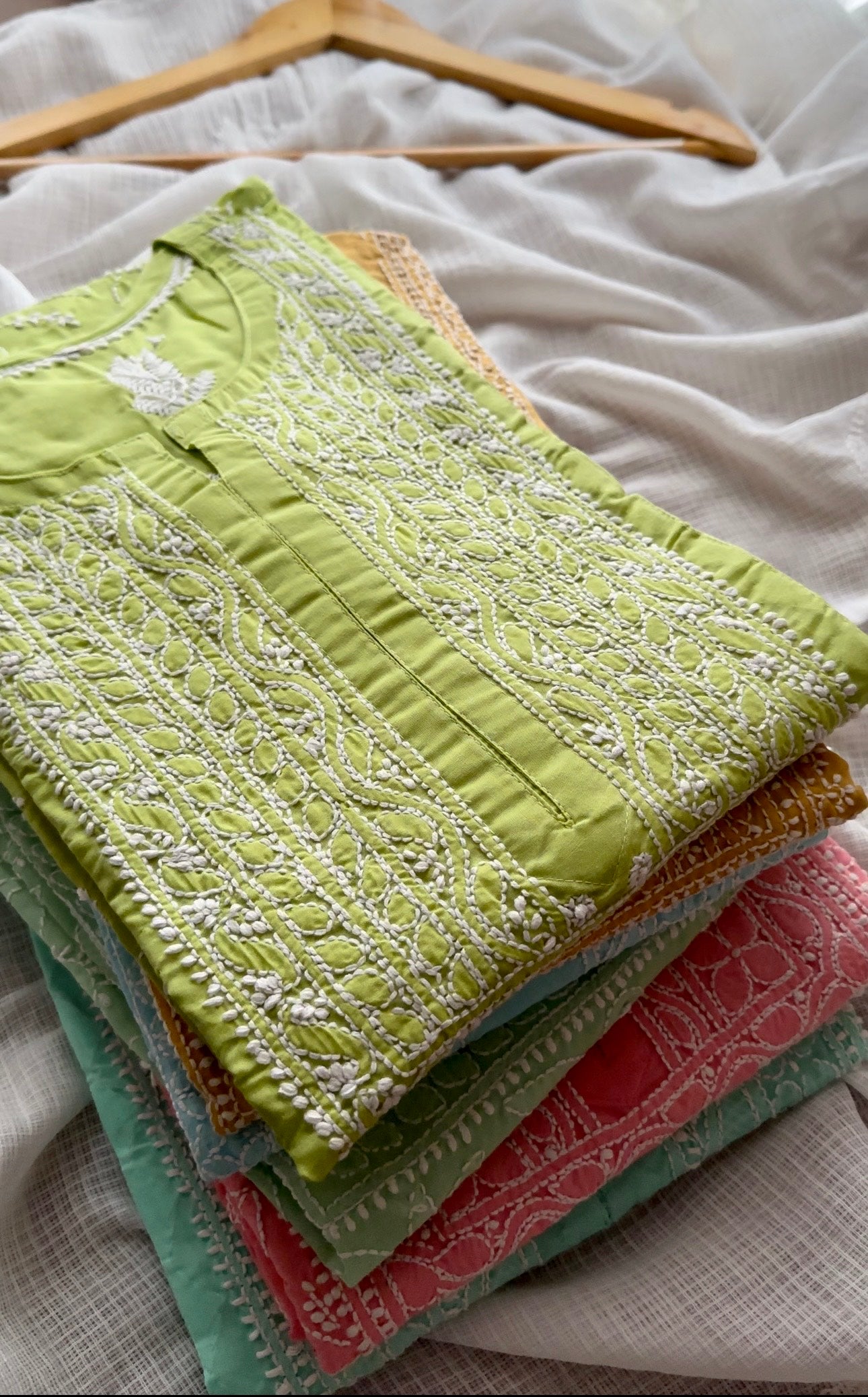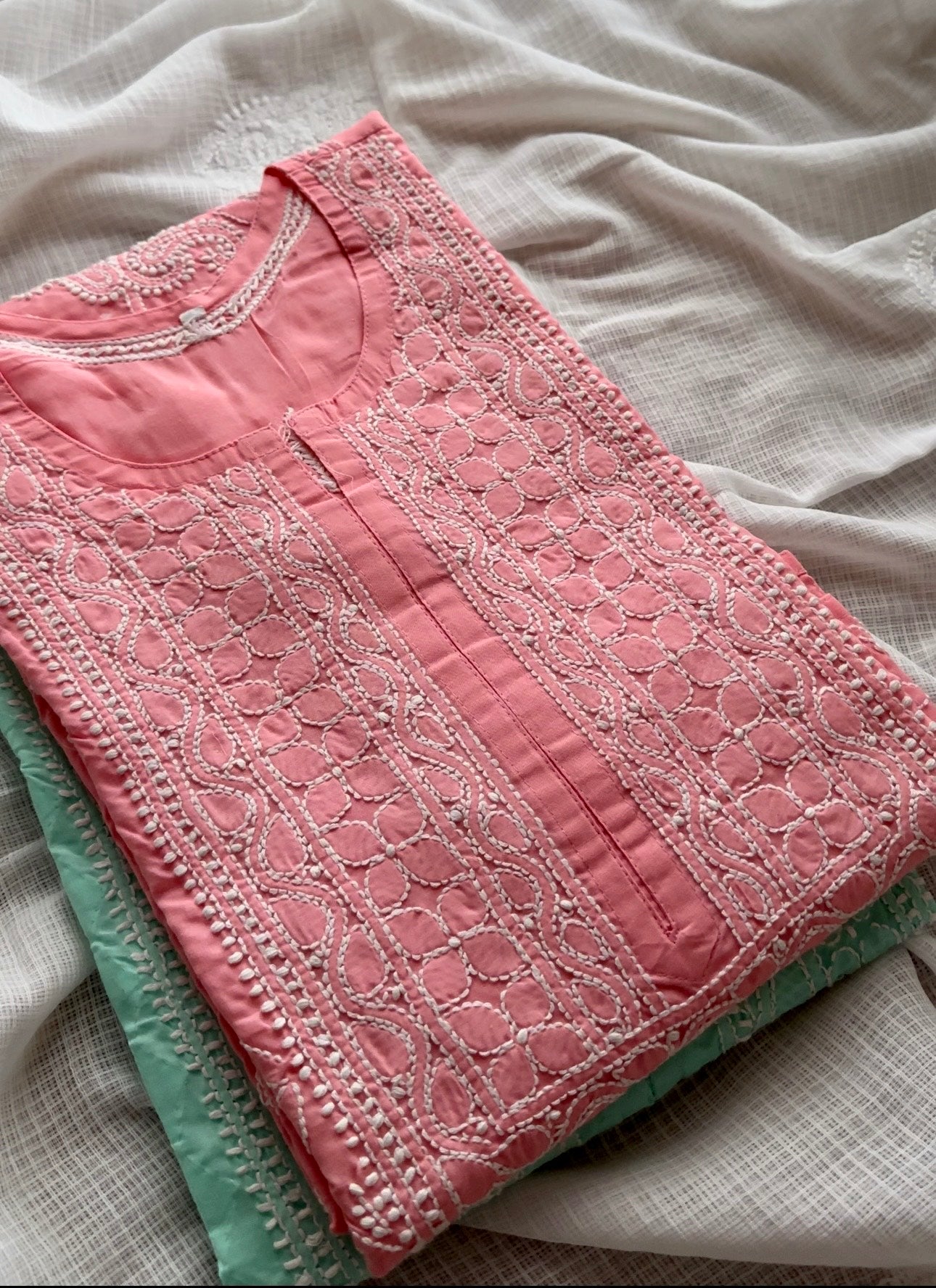 Pure cotton kurtas, With fine bakhiya work in white cotton thread work, are perfect for everyday wardrobe.