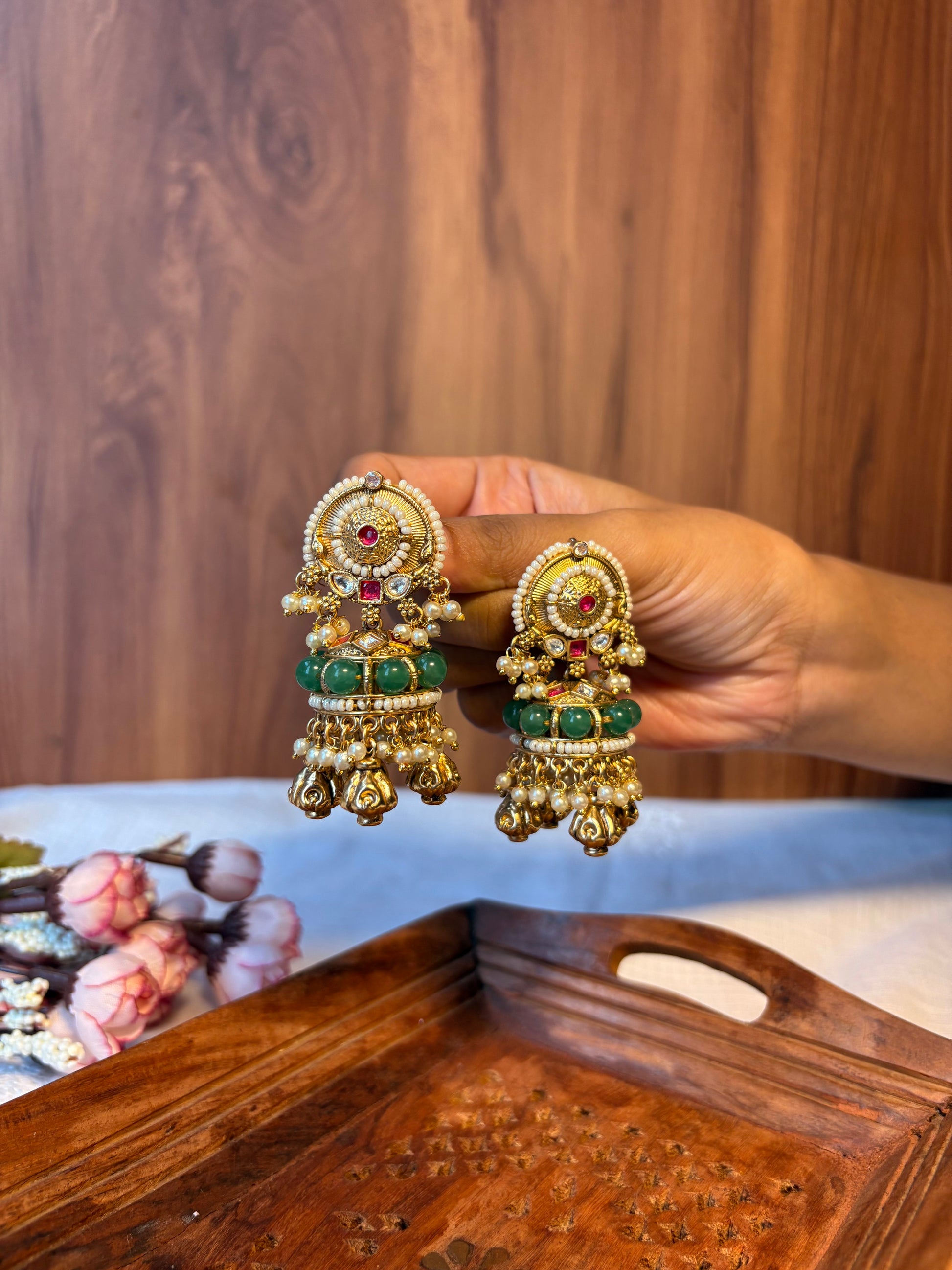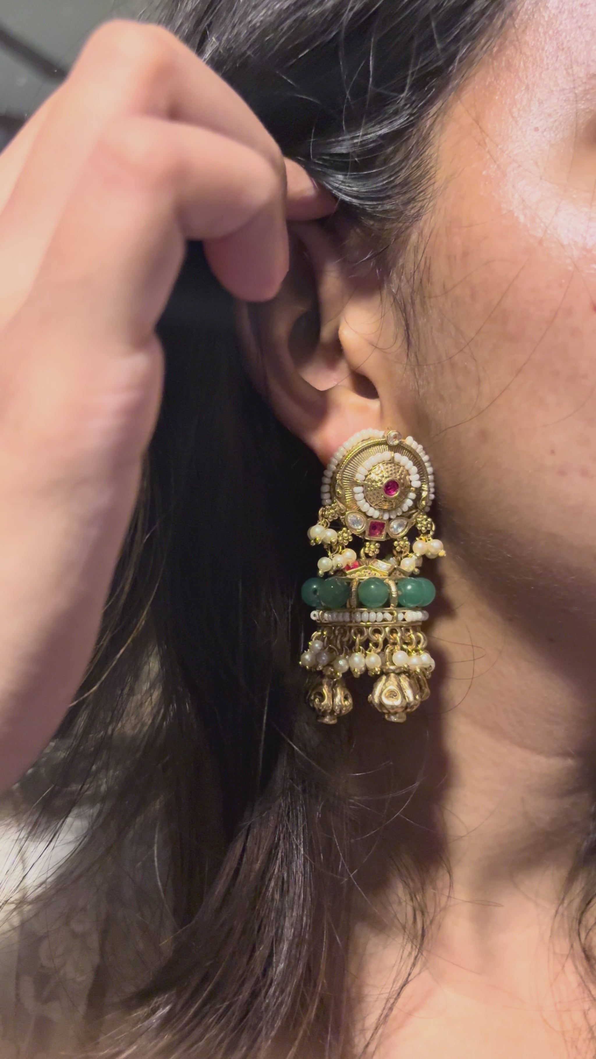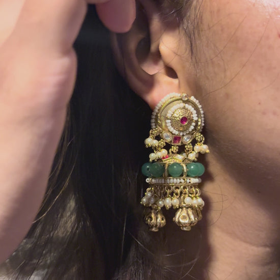 Crafted in 100% brass, this statement jhumka features a temple-inspired design with kundan work, ruby accents, green bead layering, and traditional ghungroo drops. A bold and festive piece perfect for weddings and grand occasions.